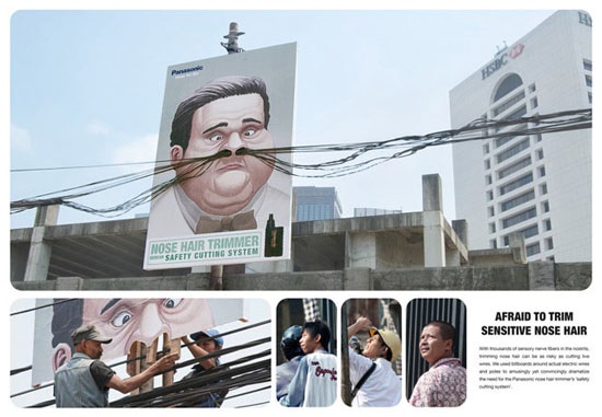 这个松下鼻毛修剪器的户外广告牌,充分利用了户外的条件,整个广告牌表现力强。大胆的想象力和巧妙的环境利用,让这个广告牌视觉冲击力特别强。